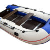 Надувная лодка СТЕЛС 355 изготовлена и ПВХ ткани плотностью 950 гр/м.кв., и представлена в современном дизайне и комбинированном сине/белом цвете.